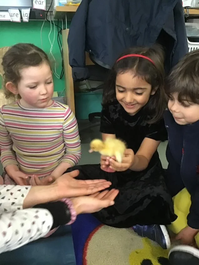 Children in Reception have the opportunity to explore the natural environment and ask/answer questions about their observations. Adults encourage children to make their own investigations to find out more, and talk about significant scientific figures from history. Children visit our chickens and observe ducklings hatching in the summer term, understanding that living things follow a life cycle.