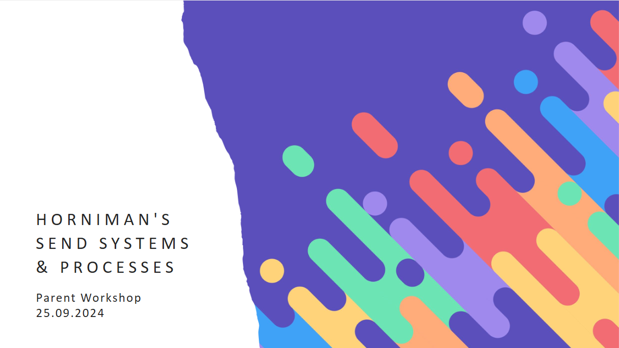 At Horniman, we run a (mostly) half-termly parent workshop focused on a range of issues which might affect children and families of children with SEND, but anyone from our school community is welcome to attend.