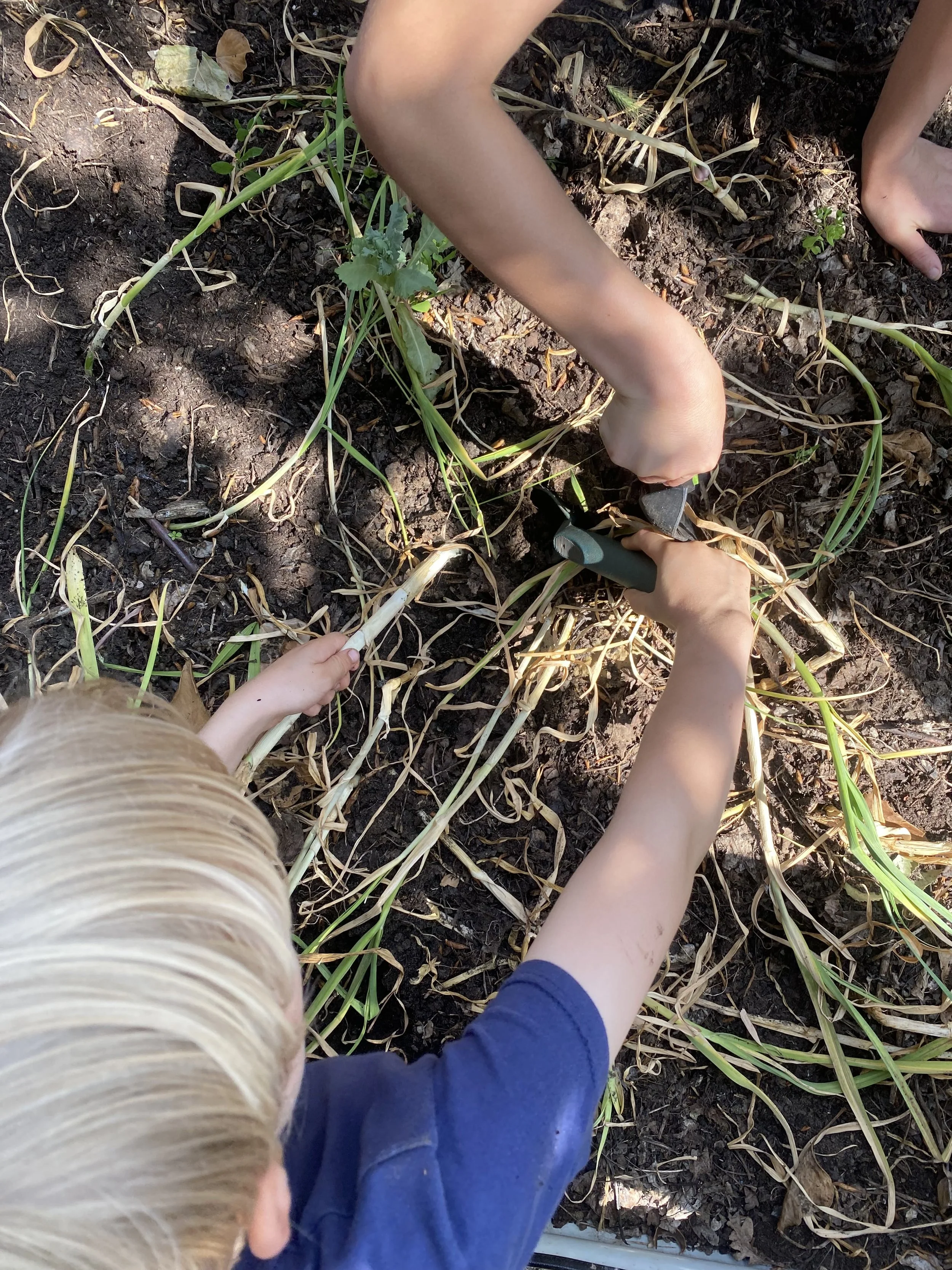 This year, we had the opportunity to take our learning outside. As one of our first projects was learning about bread, we grew some garlic and made some garlic butter to spread on our bread. We sowed the garlic bulbs in autumn, tended to them during the winter and spring. Then finally it was harvest time in June! We even got to take a few bulbs home for cooking with our families.